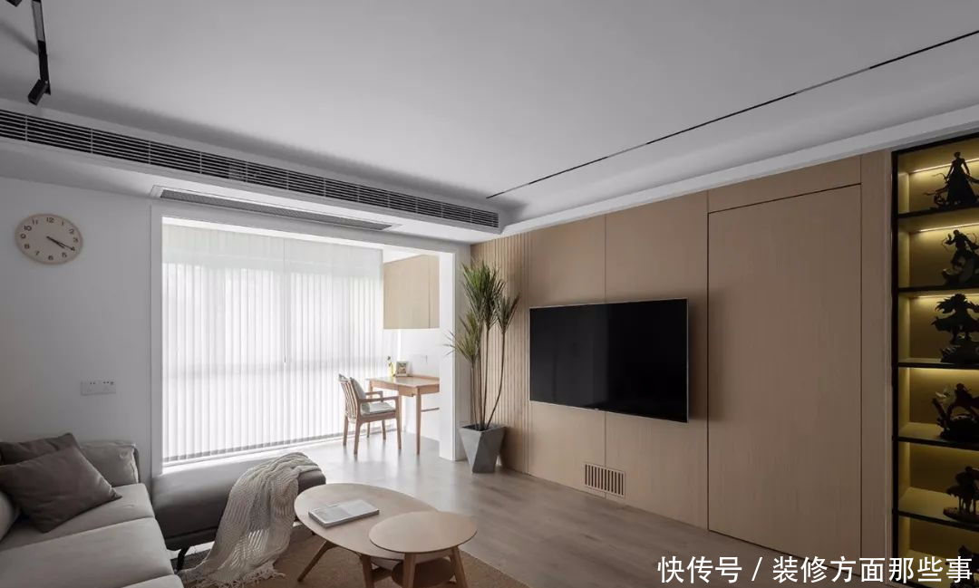 ▲?客厅电视背景墙的隐形门后面是主卧,背景墙右侧的展示柜收藏业主喜欢的手办