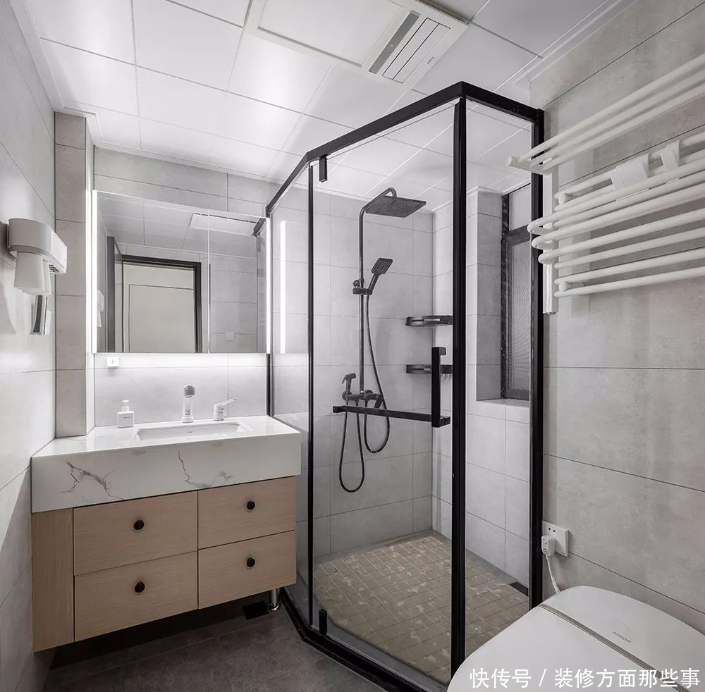 ▲?主卫,灰色地砖搭配水泥灰墙砖,原木与大理石纹的台盆柜底部架空,淋浴区导流槽设计,黑色五金彰显个性