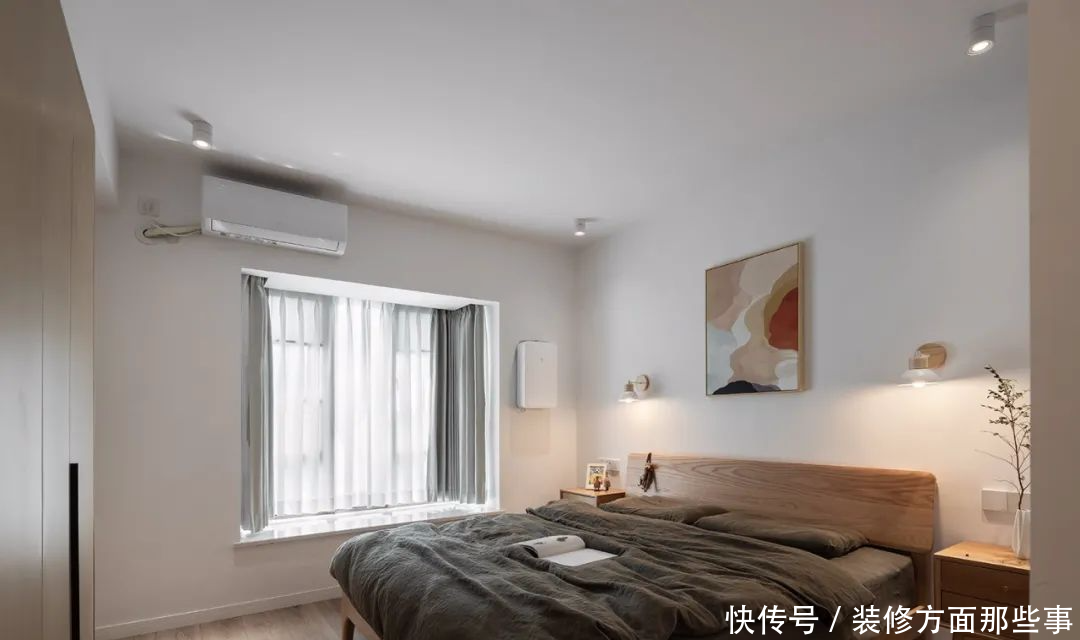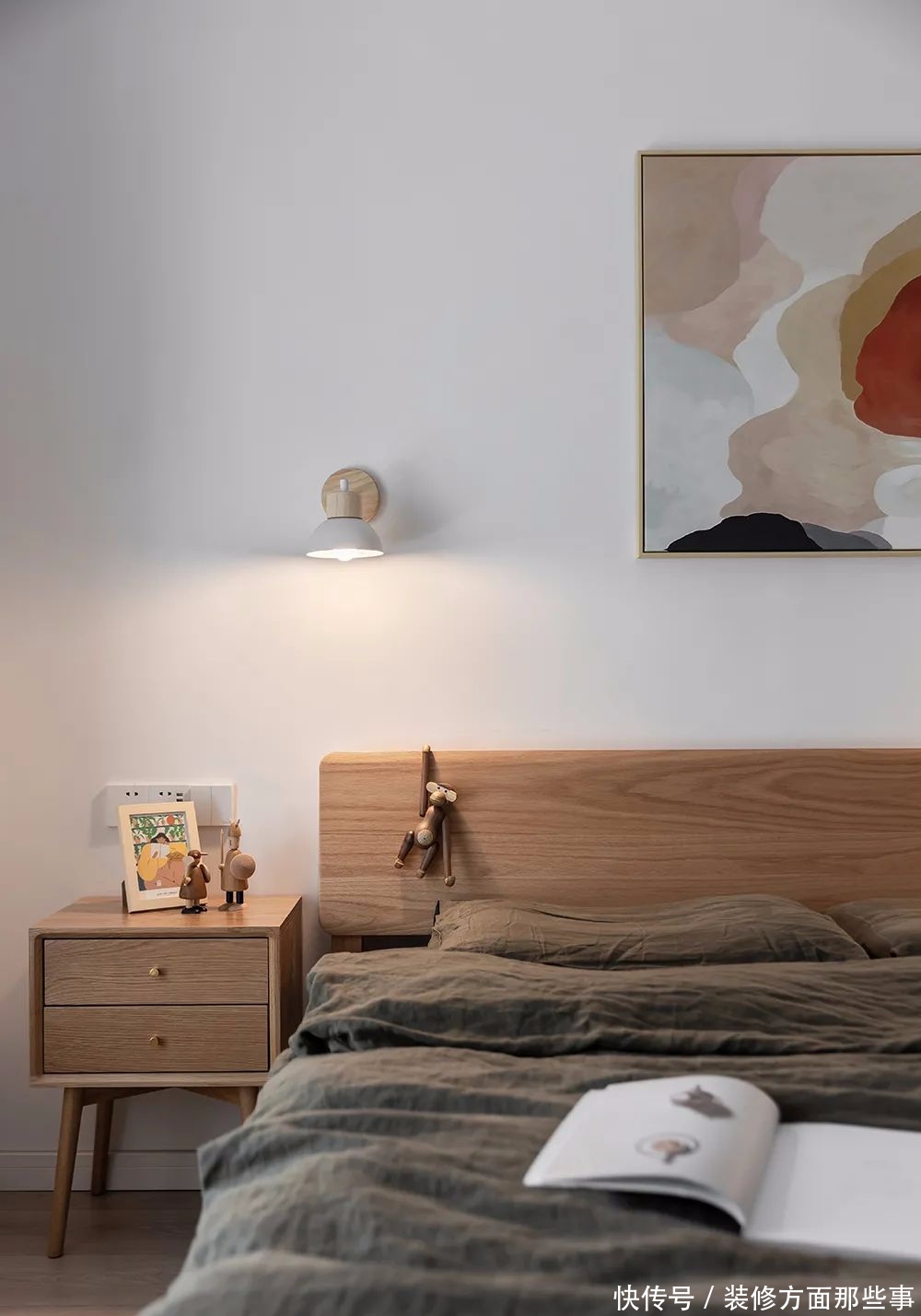 ▲?主卧,地板和家居都是以原木为主,大白墙顶造型简洁清爽,选择点光源取代主灯
